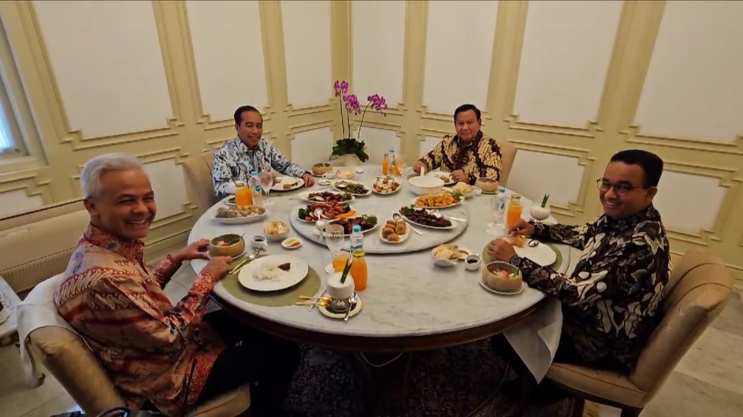 Mereka duduk di sebuah meja bundar. Jokowi dan tiga bacapres kompak mengenakan batik lengan panjang bermotif parang. #aminkanindonesia